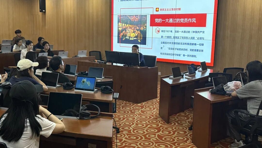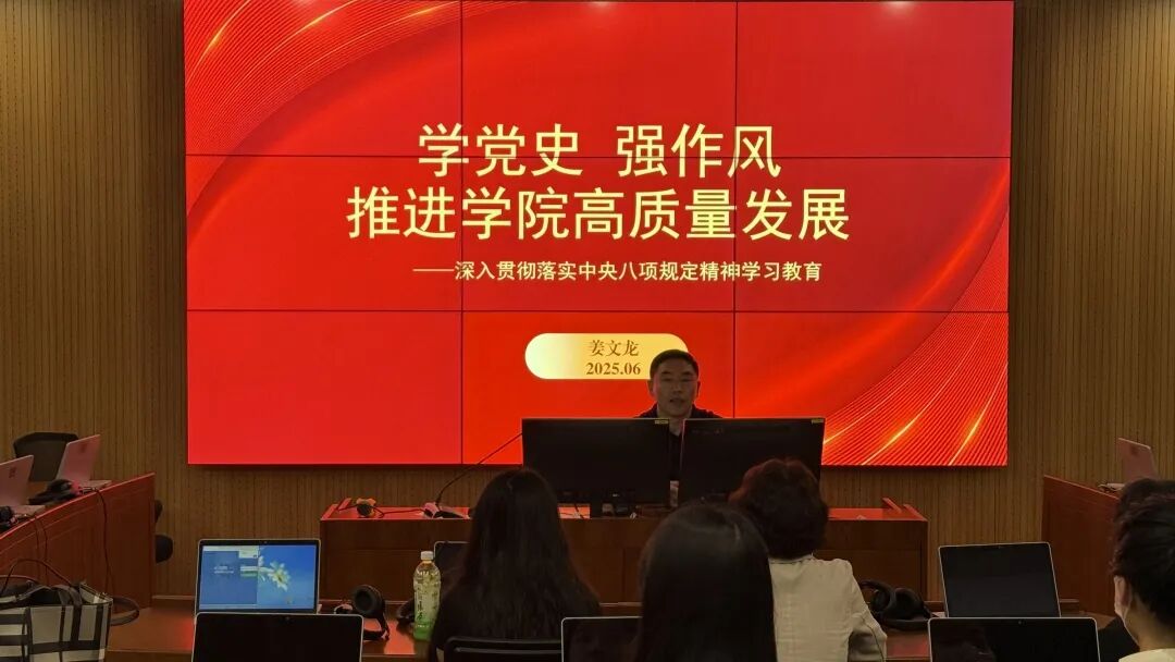 2025年6月30日下午,高级翻译学院于励业楼502开展了主题为“学党史 强作风 推进学院高质量发展”的党课,由高级翻译学院党总支书记姜文龙主讲,师生党员参加学习。
