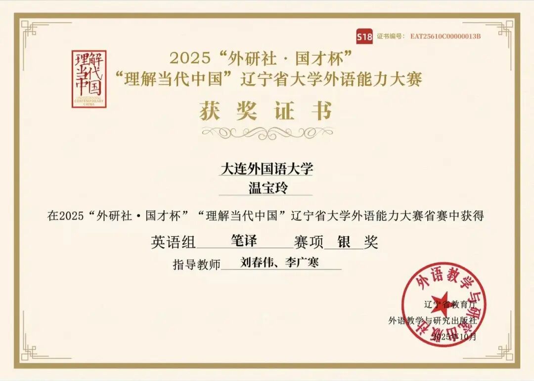 2025年10月25日,2025“外研社·国才杯”“理解当代中国”全国大学生外语能力大赛英语组笔译赛项于线上成功举办。高翻学子在激烈竞争中表现卓越,25级研究生温宝玲、22级本科生卢津韦同学荣获银奖,25级研究生李晓颖同学斩获铜奖,充分展现了扎实的语言功底与精湛的笔译技艺。