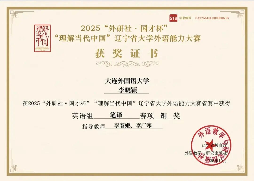 李晓颖同学竞赛经验丰富,成果斐然,曾获2024年全国大学生英语竞赛特等奖、“外研社·国才杯”校赛金奖、第三十七届韩素音国际翻译大赛汉译英优秀奖、第六届普译奖全国大学生英语写作大赛一等奖等多项荣誉,已获得CATTI三级笔译证书。