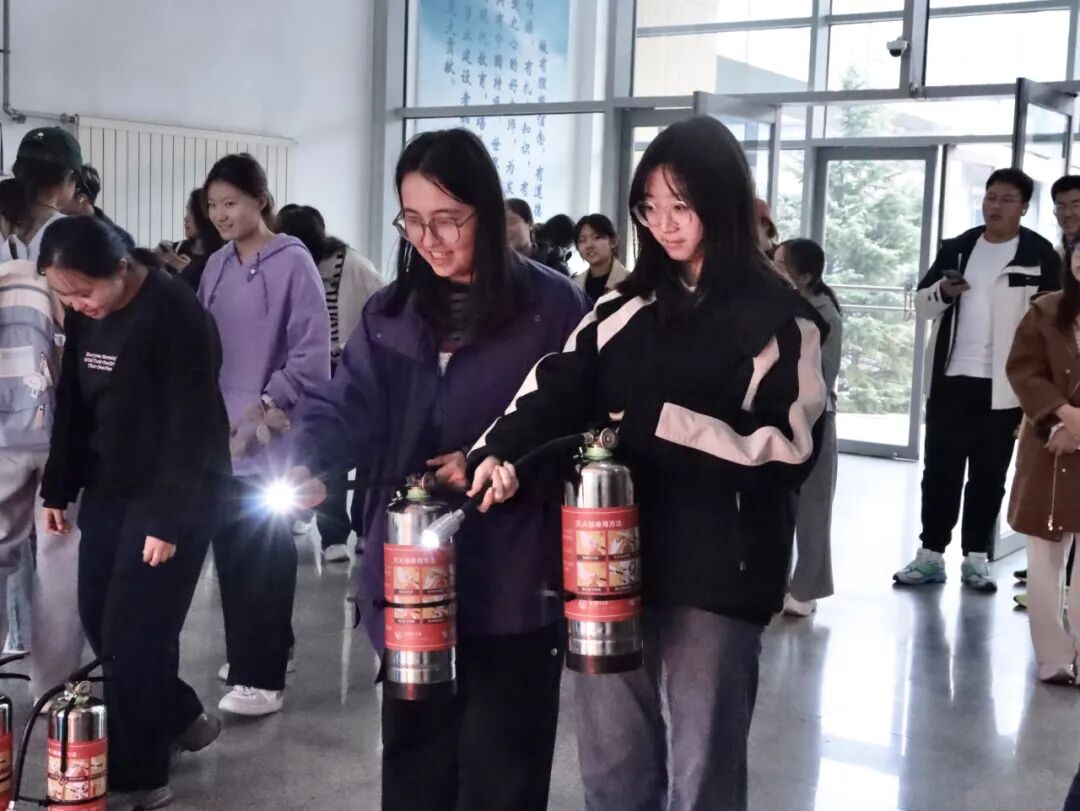 理论认知是安全防护的基础,实践实操是应急处置的核心。专题讲座结束后,消防演练正式启动。全体同学沉着冷静,在工作人员引导下,严格遵循预定疏散路线,迅速有序向指定安全区域集结,成功将所学消防知识高效转化为应急能力。演练结束后,宋龙飞老师对同学们的表现给予高度肯定,借助火灾模拟设备再次示范灭火器操作要领,并指导学生依次上前实操练习,切实巩固了消防技能学习成果。